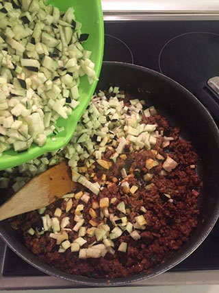Шаг 4: Параллельно, порезанные маленькими кубиками баклажаны складываются в емкость с 2-3 столовыми ложками соли, чтобы избежать потемнения. Далее баклажаны промываются процеживаются и, вместе с мелко порезанным перцем, добавляются в приготовляемую смесь на сковороду.