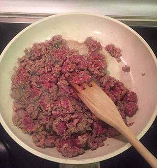 Шаг 2: Параллельно, на другой сковороде слегка обжаривается фарш с тем, чтобы из него ушла кровь.