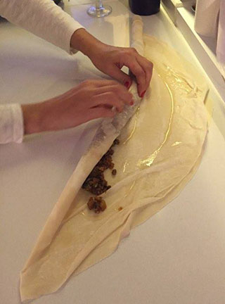Шаг 3: Поверх добавляя немного "соуса", с помощью ложки равномерно раскладывается начинка. Тесто сворачивается в трубочку небольшого диаметра.