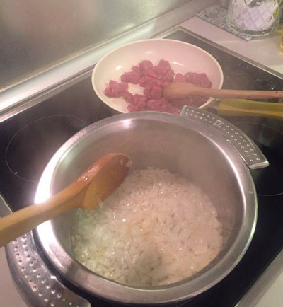 Шаг 4: В глубокой кастрюле на масле (растительном или маргарине) поджаривается до порозовения лук, нарезанный кубиками.