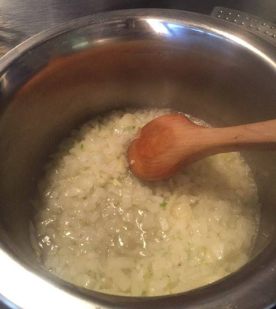 Шаг 4: В глубокой кастрюле на масле (растительном или маргарине) лук, нарезанный кубиками, поджаривается до порозовения.