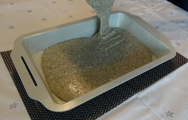 Шаг 5: Получившееся тесто выливается в смазанный маслом противень.