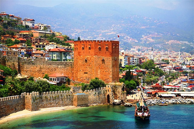 Главным сооружением крепости является Красная башня или Kızılkule, названная так по той причине, что её верхняя часть, куда чисто по техническим причинам нельзя было поднять камни, была сложена из обожженного красного кирпича. Башня располагается в нижней части крепости, примыкая к порту города. Ну и является символом Аланьи.